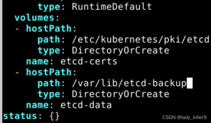 # 将volume配置的path: /var/lib/etcd改成/var/lib/etcd-restore volumes: - hostPath: path: /etc/kubernetes/pki/etcd type: DirectoryOrCreate name: etcd-certs - hostPath: path: /var/lib/etcd-restore