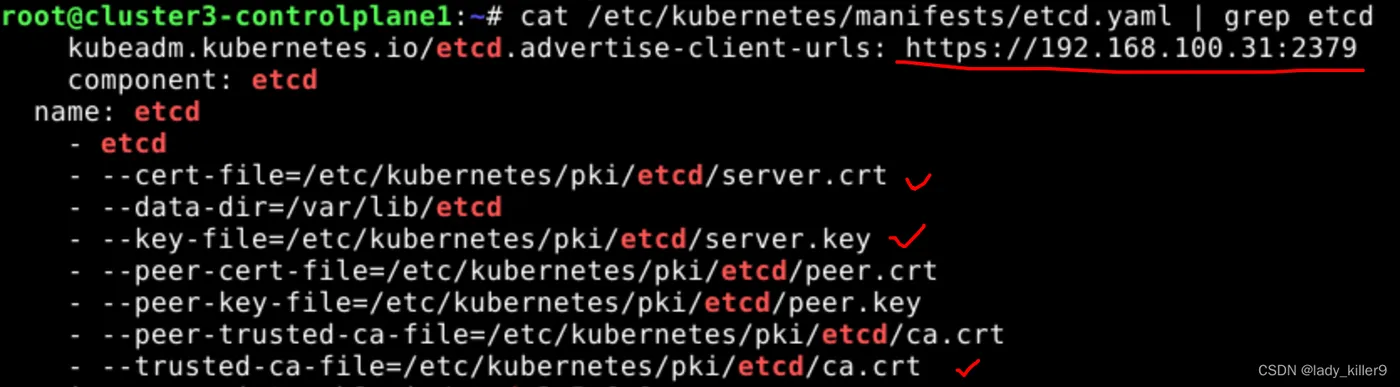 - --cert-file=/etc/kubernetes/pki/etcd/server.crt - --key-file=/etc/kubernetes/pki/etcd/server.key - --trusted-ca-file=/etc/kubernetes/pki/etcd/ca.crt