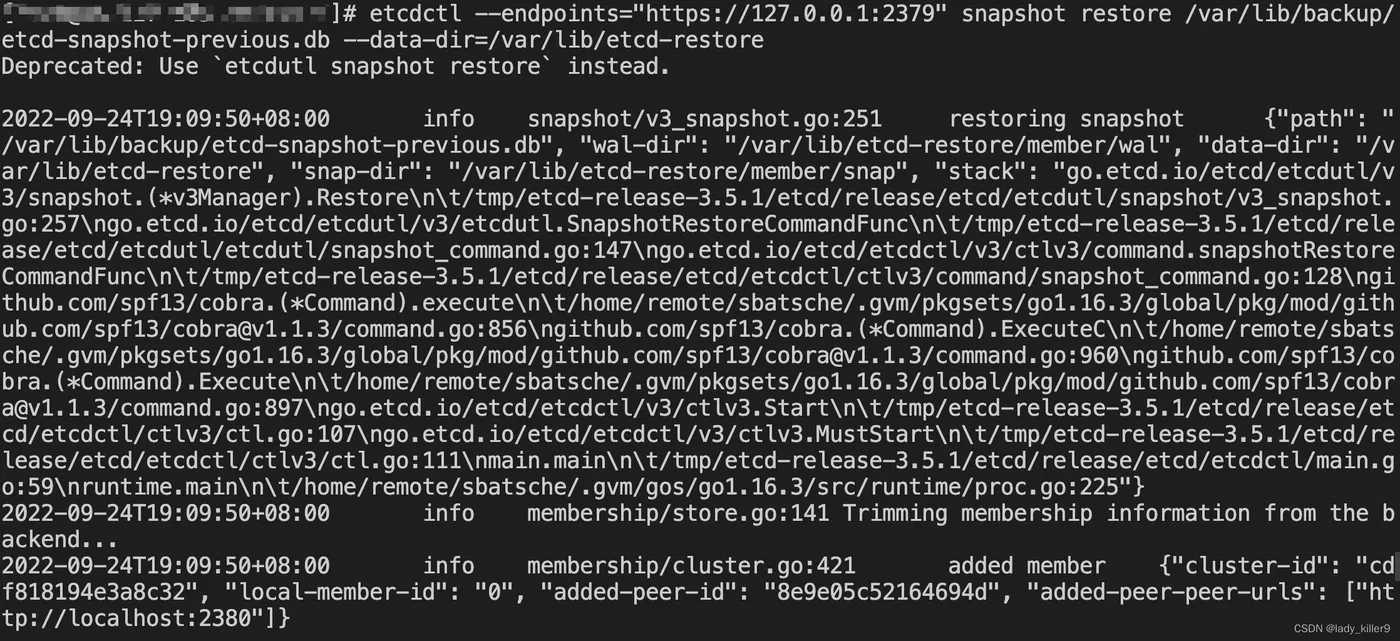 然后恢复一个已经存在的快照: /var/lib/backup/etcd-snapshot-previous.db
