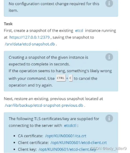针对存在的etcd实例https://127.0.0.1:2379,创建一个快照,保存到/srv/data/etcd-snapshot.db。在创建快照的过程中,如果卡住了,就键入ctrl+c终止,然后重试。