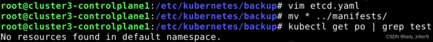 最后恢复备份,确认集群仍在工作,并且创建的Pod已不在。