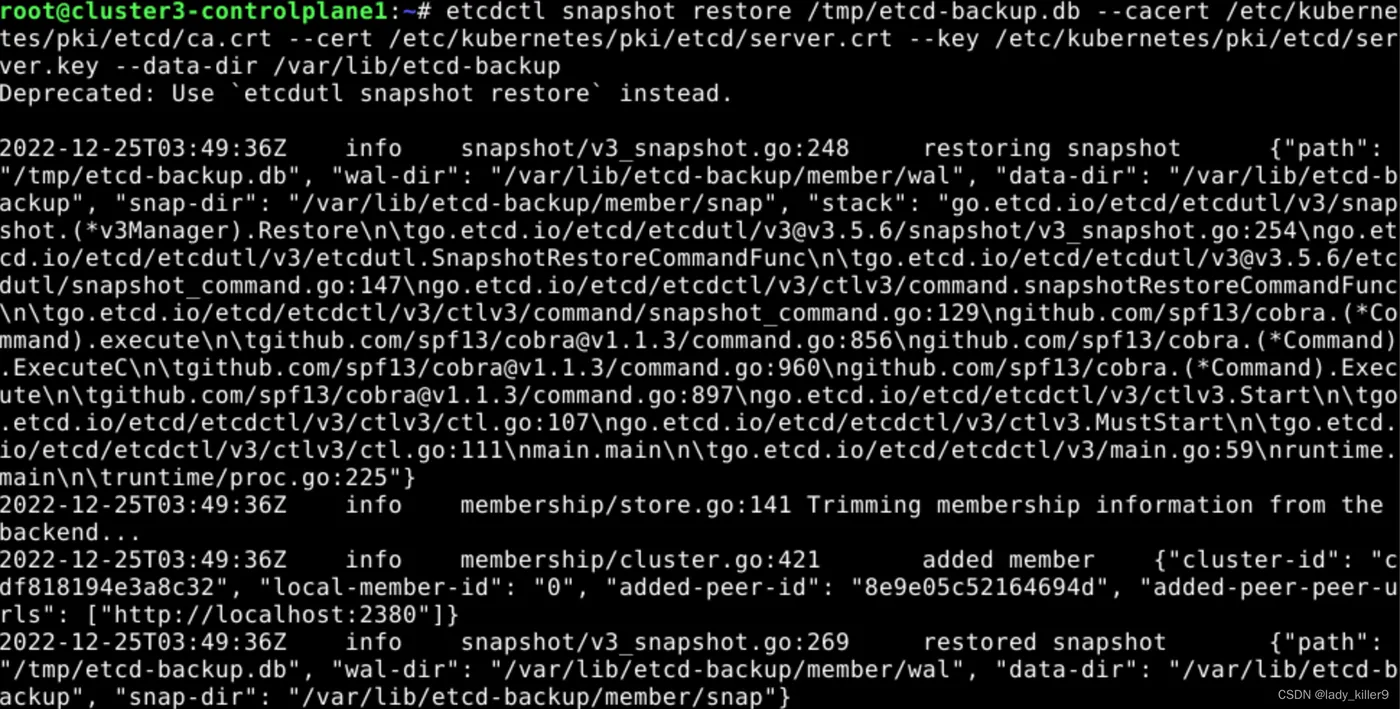 etcdctl snapshot restore /tmp/etcd-backup.db \ --data-dir /var/lib/etcd-backup \ --cacert /etc/kubernetes/pki/etcd/ca.crt \ --cert /etc/kubernetes/pki/etcd/server.crt \ --key /etc/kubernetes/pki/etcd/server.key