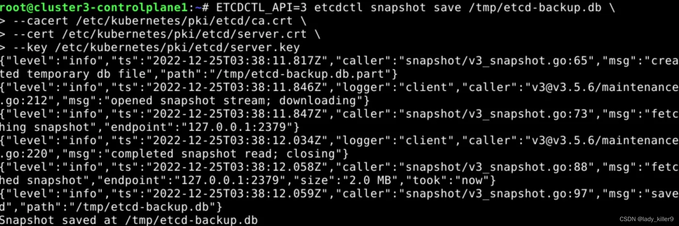 ETCDCTL_API=3 etcdctl snapshot save /tmp/etcd-backup.db \ --cacert /etc/kubernetes/pki/etcd/ca.crt \ --cert /etc/kubernetes/pki/etcd/server.crt \ --key /etc/kubernetes/pki/etcd/server.key