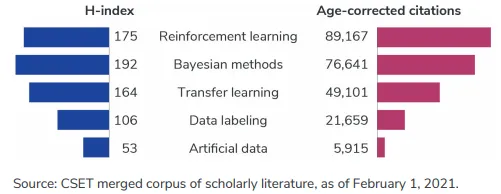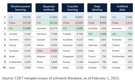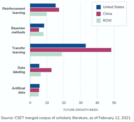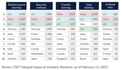 根据我们基于聚类的研究方法,美国和中国在小数据方法上竞争激烈 ,在我们考虑的五个类别中,美国和中国都是前两个国家(按研究论文数量计算)。虽然美国在两种最大的方法(强化学习和贝叶斯方法)上拥有很大的领先优势,但中国在迁移学习(增长最快的类别)上拥有较小但不断增长的领先优势。