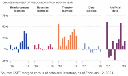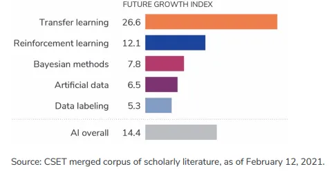 图5根据CSET开发的预测模型比较了每个类别的三年增长预测,并将另一个类别的“AI整体”论文作为基准进行比较如图所示,迁移学习是唯一一个预计增长速度超过人工智能研究整体的类别,远远超过所有其他类别,与前几年的持续增长一致。
