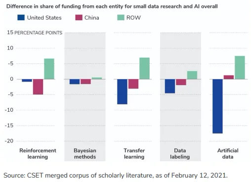 在中国,除了人工数据生成,政府对小数据方法的资助份额总体上小于人工智能,尽管差异不像美国那么大。