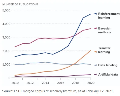 为了探索小数据方法的研究是如何进行的,我们使用CSET的研究集群数据集来确定与上述五个类别相关的研究(迁移学习、数据标记、人工数据生成、贝叶斯方法和强化学习)。研究集群是由引用链接连接起来的一组科学研究文章,在这些实例中,研究人员正在交流他们使用的想法、方法、结果,或以其他任何方式建立在其他研究人员的工作之上。