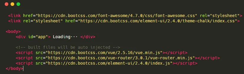 这样 webpack 就不会把 vue.js, vue-router, element-ui 库打包了。声明一下,我把 main.js 中对 element 的引入删掉了,不然我发现打包后的 app.css 还是会把 element 的 css 打包进去,删掉后就没了。