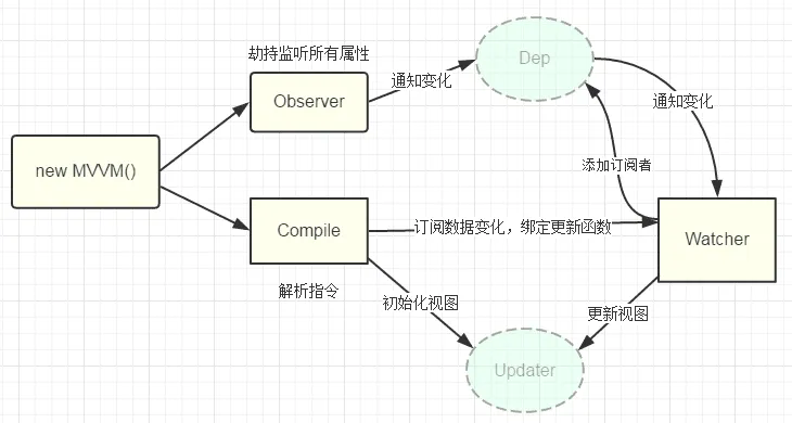 - MVVM 作为数据绑定的入口,整合 Observer、Compile 和 Watcher 三者,通过Observer来监听自己的 model 数据变化,通过 Compile 来解析编译模板指令,最终利用 Watcher 搭起 Observer 和 Compile 之间的通信桥梁,达到数据变化 -> 视图更新;视图交互变化(input) -> 数据 model 变更的双向绑定效果。