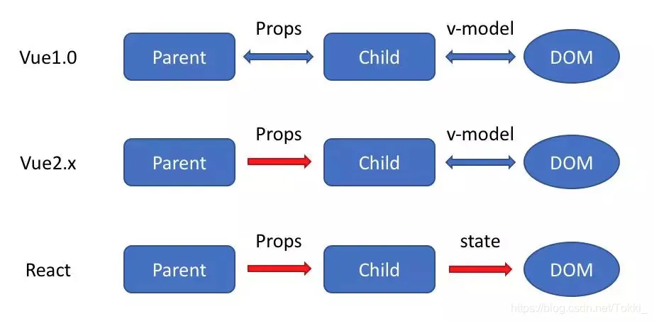 不过由于我们一般都会用 Vuex 以及 Redux 等单向数据流的状态管理框架,因此很多时候我们感受不到这一点的区别了。