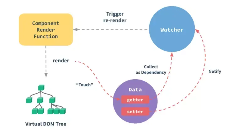 - 当 Vue Component render 函数被执行的时候, data 上会被 触碰(touch), 即被读, getter 方法会被调用, 此时 Vue 会去记录此 Vue component 所依赖的所有 data。(这一过程被称为依赖收集)
