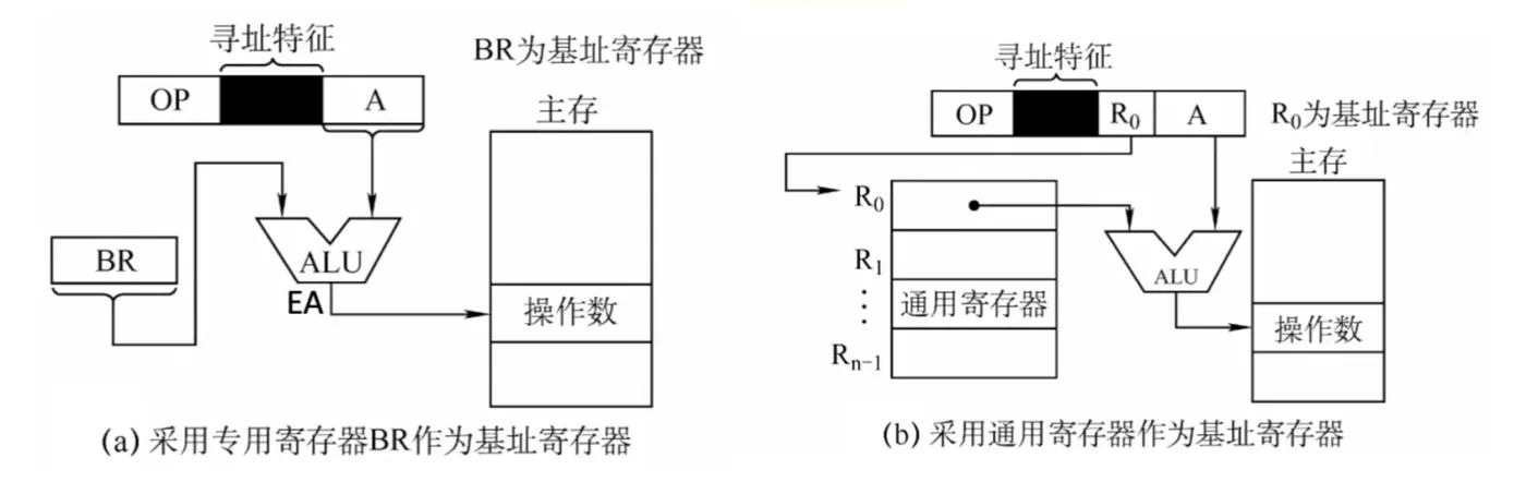 基址寻址:将CPU中基址寄在器(BR)的内容加上指令格式中的形式地址A,形成操作数的有效地址,即$EA=(BR)+A$