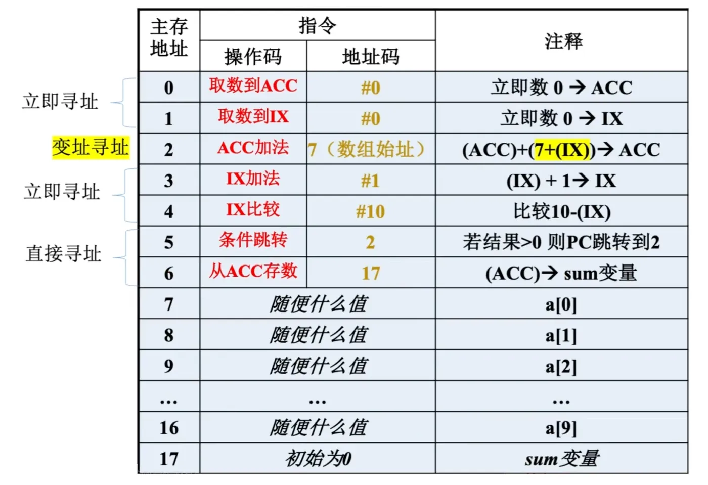 立即寻址:形式地址A就是操作数本身,又称为立即数,一般采用补码形式。#表示立即寻址特征。