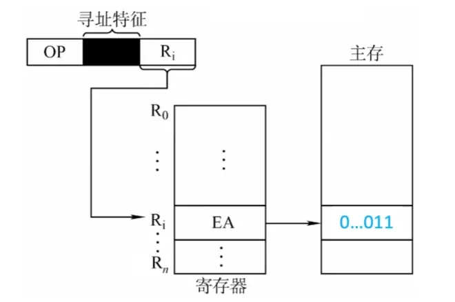 寄存器间接寻址:寄存器R中给出的不是一个操作数,而是操作数所在主存单元的地址,即$EA=(R_i)$
