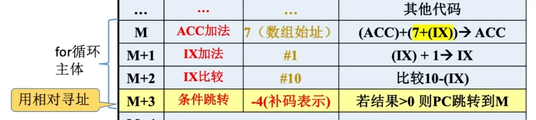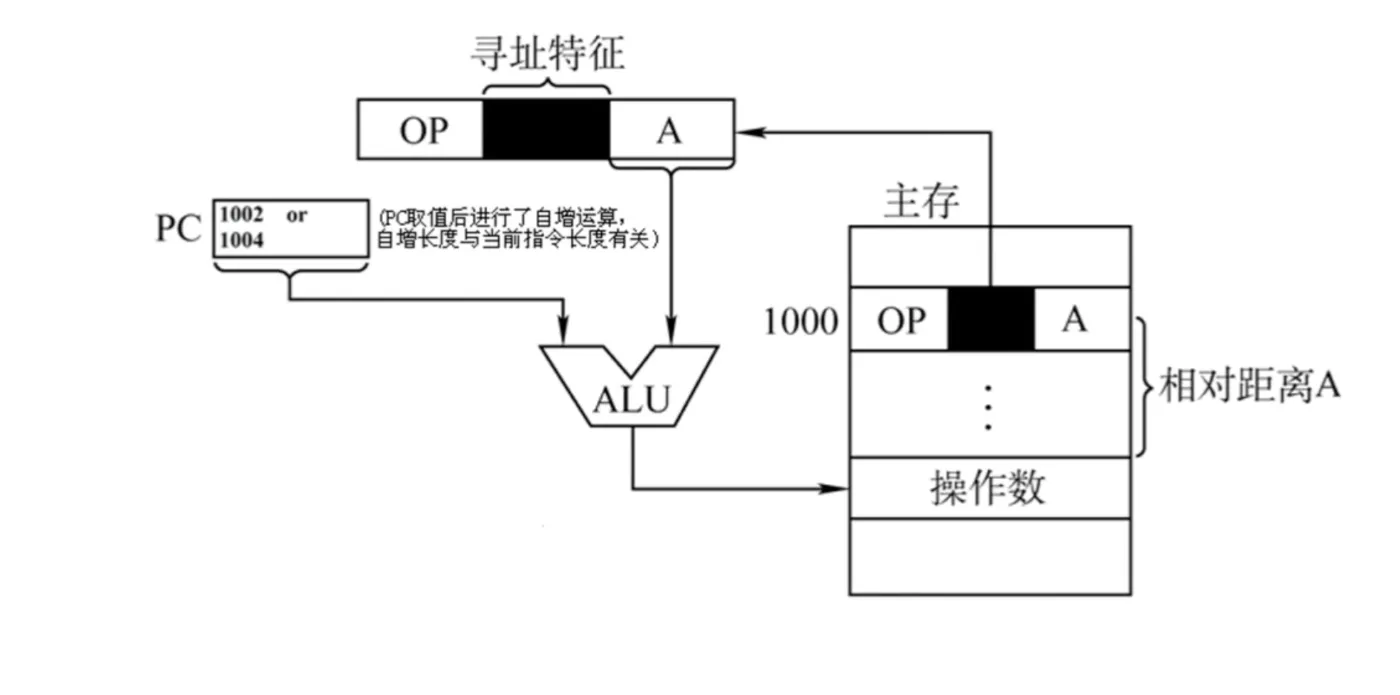 相对寻址:把程序计数器PC的内容加上指令格式中的形式地址A而形成操作数的有效地址,$EA=(PC)+A$,其中A是相对于PC所指地址的位移量,可正可负,补码表示。