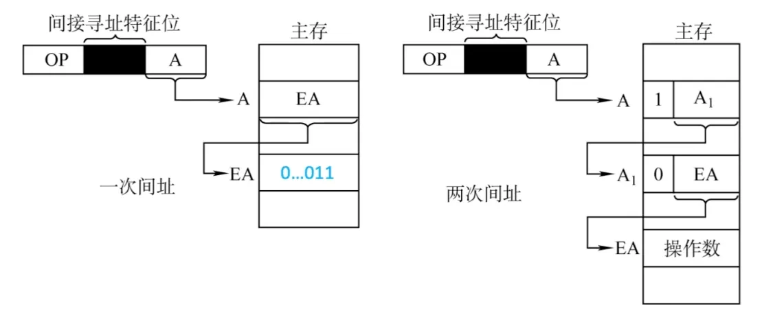 间接寻址:指令的地址字段给出的形式地址不是操作数的真正地址,而是操作数有效地址所在的存储单元的地址,也就是操作数地址的地 址,即EA = (A)