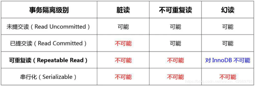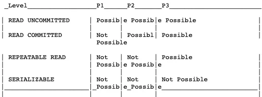 这里面有一张表格(搜索_iso),里面定义了四个隔离级别,右边的 P1 P2 P3 就是代表事务并发的 3 个问题,脏读,不可重复读,幻读。Possible 代表在这个隔离级别下,这个问题有可能发生,换句话说,没有解决这个问题。Not Possible 就是解决了这个问题。