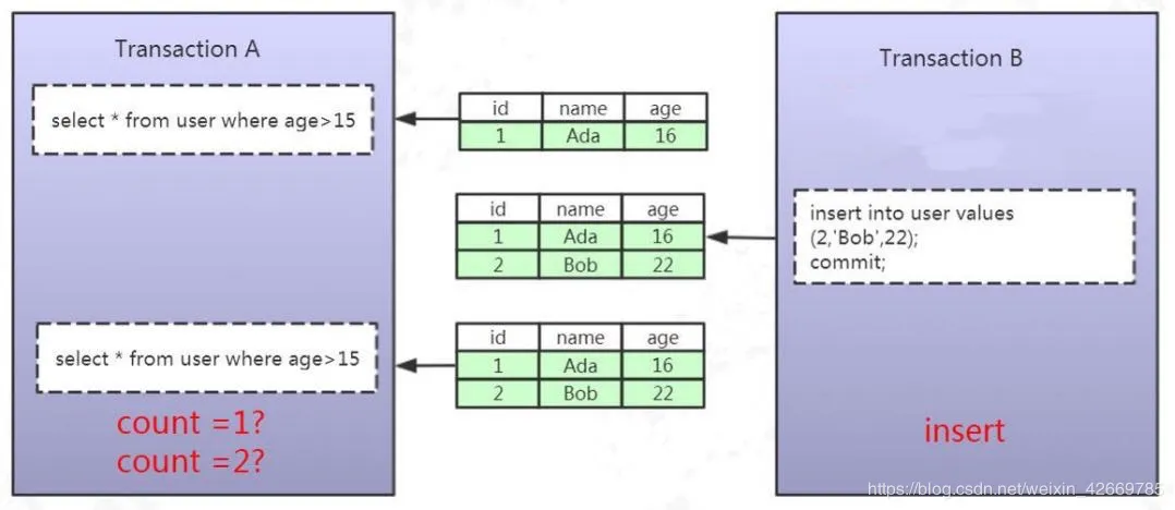 在第一个事务里面我们执行了一个范围查询,这个时候满足条件的数据只有一条。在第二个事务里面,它插入了一行数据,并且提交了。重点:插入了一行数据。在第一个事务里面再去查询的时候,它发现多了一行数据。这种情况,又是什么呢?