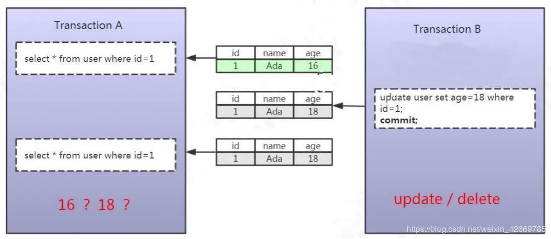 同样是两个事务,第一个事务通过 id=1 查询到了一条数据。然后在第二个事务里面执行了一个 update 操作,这里大家注意一下,执行了 update 以后它通过一个 commit 提交了修改。然后第一个事务读取到了其他事务已提交的数据导致前后两次读取数据不一致的情况,就像这里,age 到底是等于 16 还是 18,那么这种事务并发带来的问题,