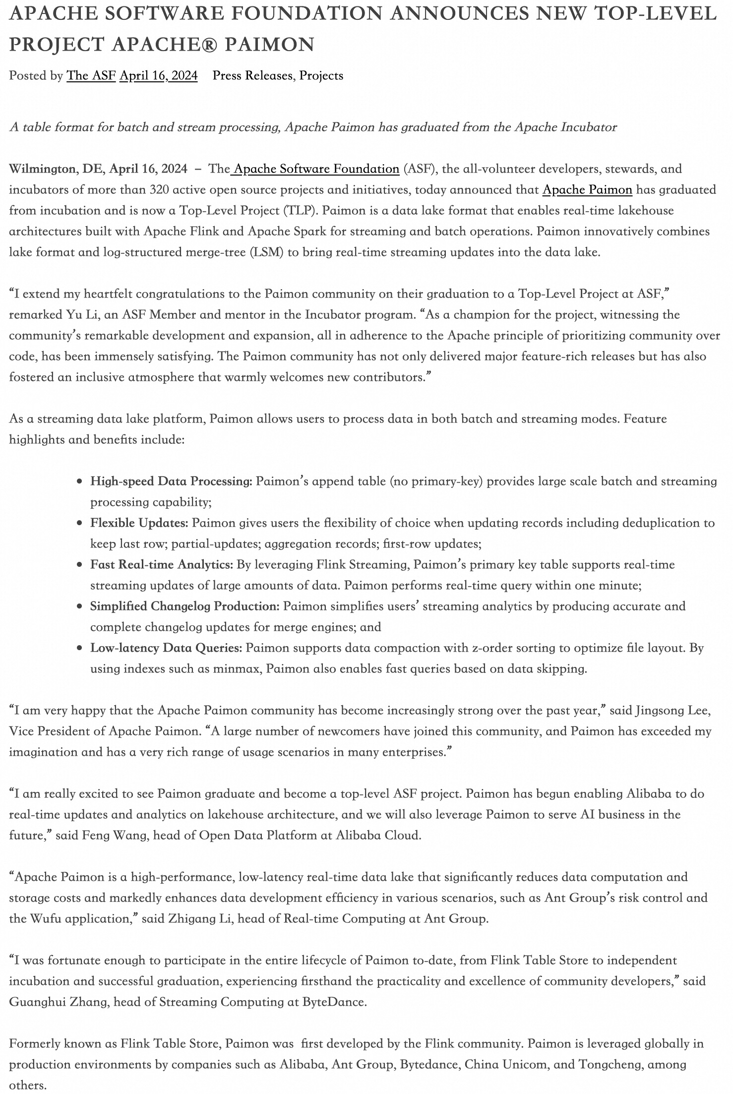 祝贺 Paimon 毕业并成为 ASF 的顶级项目。事实上,Paimon 已经开始帮助阿里巴巴对 Lakehouse 架构进行实时更新和分析,此外,我们还将在未来利用 Paimon 为 AI 业务服务。