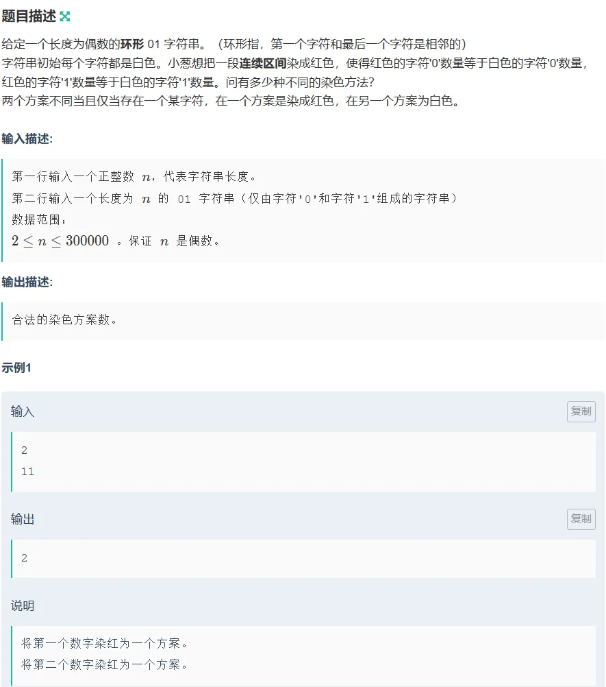 #include <iostream> using namespace std; int main() { int n; cin >> n; string s; cin >> s; int zero=0, one=0; for(auto ch : s) { if(ch=='0') zero++; if(ch=='1') one++; } int res=0; int half=n/2; int zero_cnt=0, one_cnt=0; int left=0, right=0; while(right<n-1) //细节:防止重复计数 { if(s[right]=='0') zero_cnt++; if(s[right]=='1') one_cnt++; while(right-left+1>half) { if(s[left]=='0') zero_cnt--; if(s[left]=='1') one_cnt--; left++; } if(right-left+1==half) { if(zero_cnt*2==zero && one_cnt*2==one) res+=2; } right++; } cout << res << endl; return 0; }