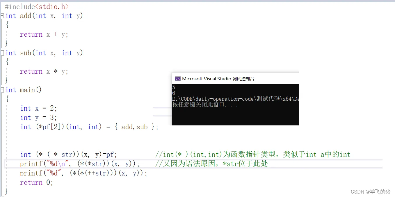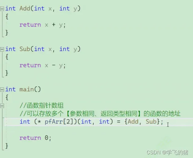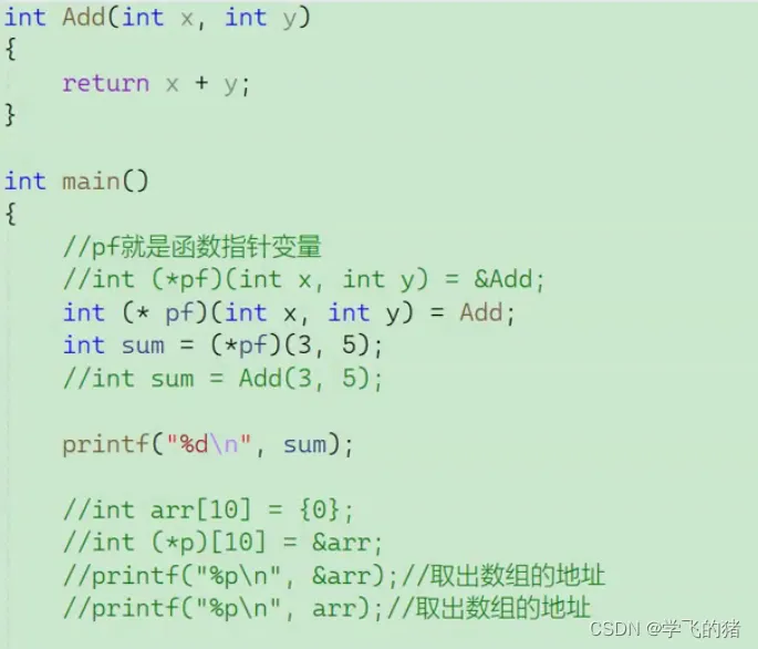 //pf用于存放Add的地址,*pf中的 * 可以省略,*并不是语法需求,且 * 的多少对结果的输出没有影响。