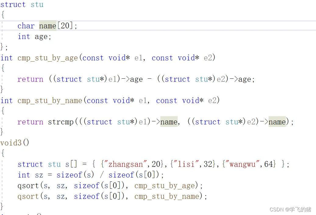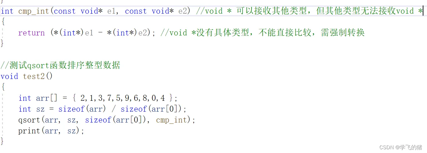 int (*cmp)(const void*,cons void*) //比较2个元素大小的指针,值得注意的是 //对于不同的元素种类,比较方式也就不同。此处可调用自己所编写的比较函数。