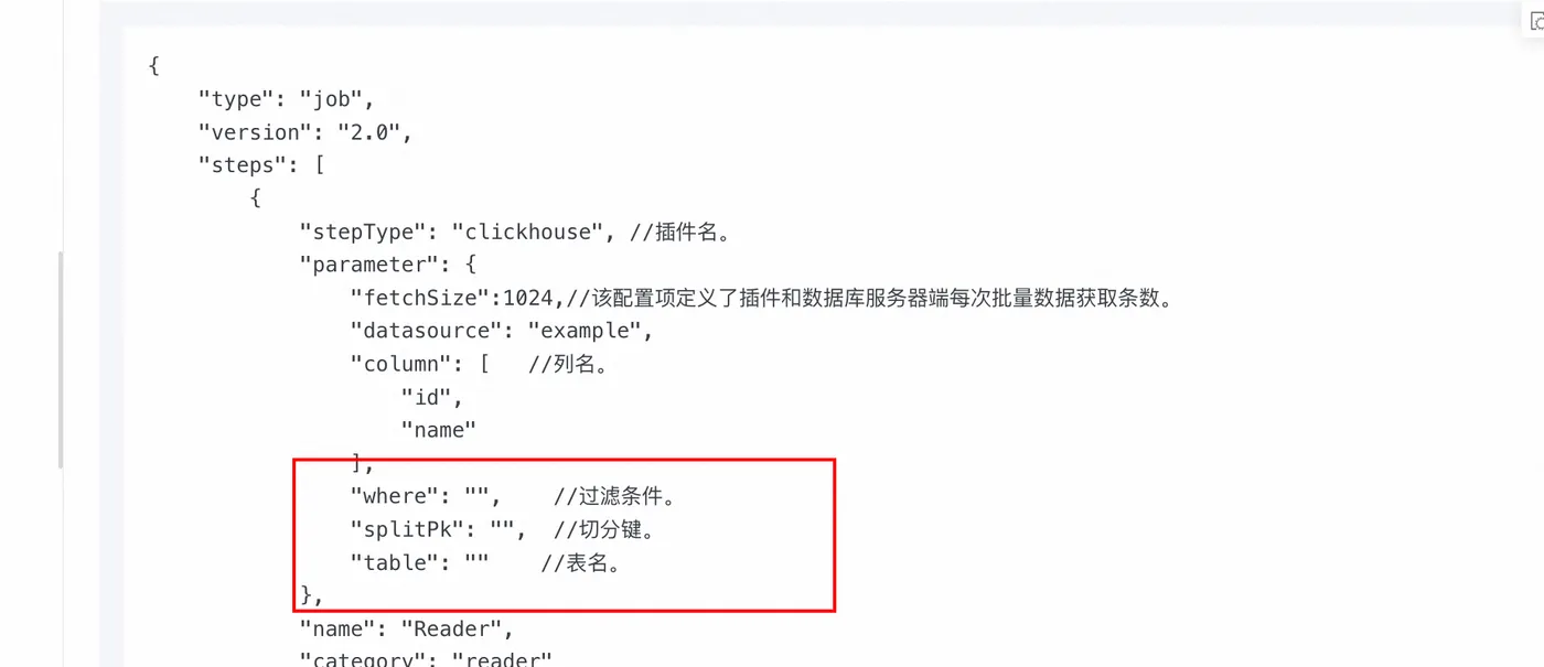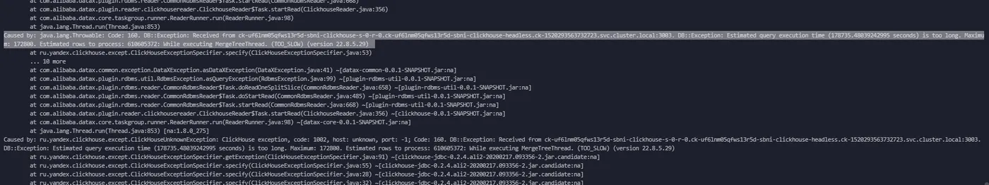 查询超时 这个超时看着应该是服务端配置的 可以和ck的dba同学确认看下查询的超时时间设置的多长1)优化ck任务,加切分键 尽量使用业务主键 加并发,reader最终应该会拼接成查询语句 调整这些参数相当于优化查询sql2)ck数据源配置jdbc看是否可以加超时参数设置之类的3)ck服务端调整超时参数4)任务拆分执行 每次少同步写