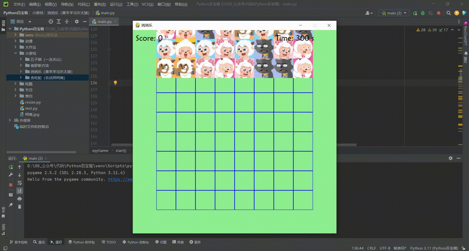 本期内容:基于pygame实现喜羊羊与灰太狼版消消乐小游戏