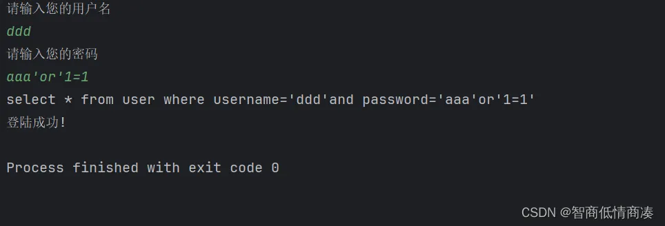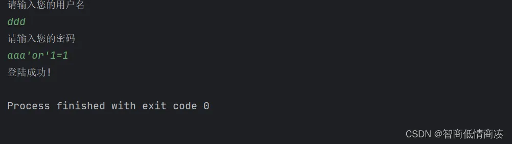 通过对于SQL语句的打印,发现是输入的密码让原本的SQL语句的意义发生了改变,因为or之后的1=1永远成立,因此不管密码账号是否是正确的,都一直都能够登录成功