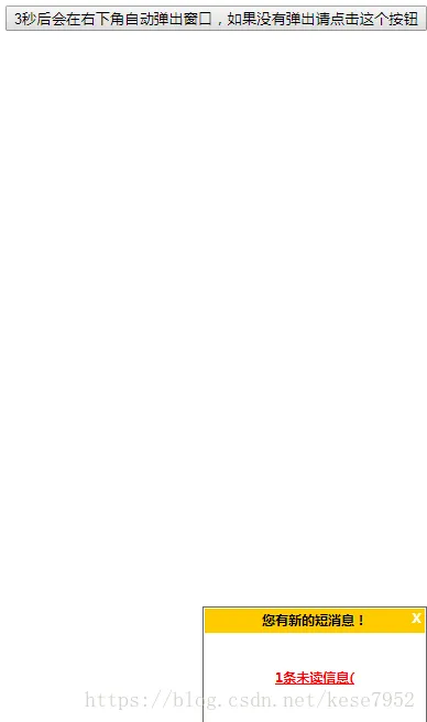 <html> <body> <div id="silu"> <button onclick="tips_pop()">3秒后会在右下角自动弹出窗口,如果没有弹出请点击这个按钮</button> </div> <div id="winpop"> <div class="title">您有新的短消息!<span class="close" onclick="tips_pop()">X</span></div> <div class="con">1条未读信息(</div> </div> </body> </html>