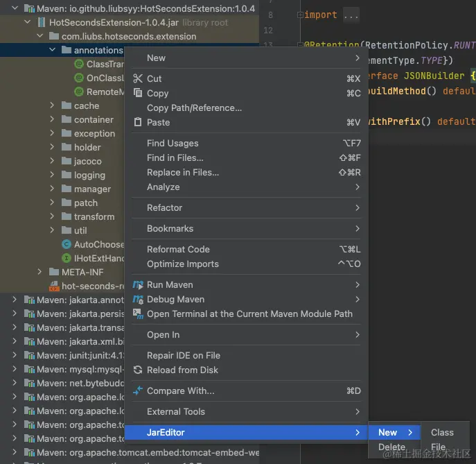 在jar包的工程展示图,任意文件右键,可以看到JarEditor的New和Delete操作,可以新增文件和删除文件