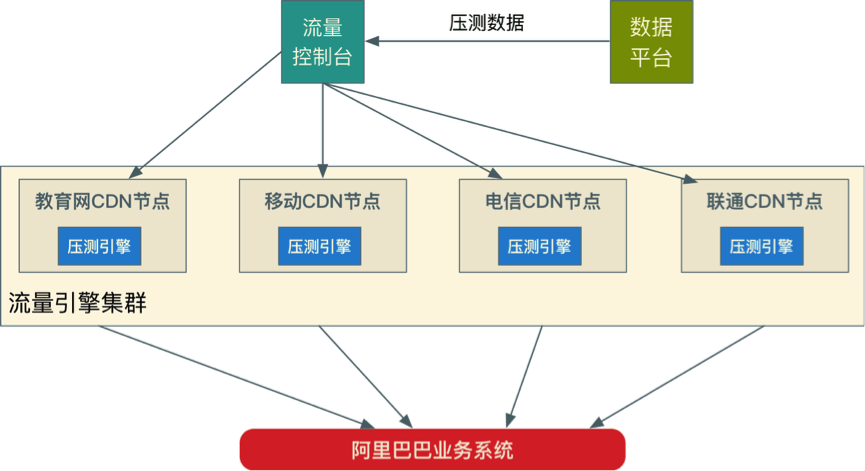 双11当天0点的峰值流量是平时高峰的几百倍,每秒钟几百万次的请求如何构造同样成了压测的大难题。浏览器引擎或者一些开源压测工具来模拟用户请求的做法经过实际测试,要制作出双11规模的用户流量需要准备几十万台服务器的规模,成本是无法接受的,并且在集群控制、请求定制上存在不少限制。既然没有现成的工具可以使用,只好选择自己研发一套全链路压测的流量平台。