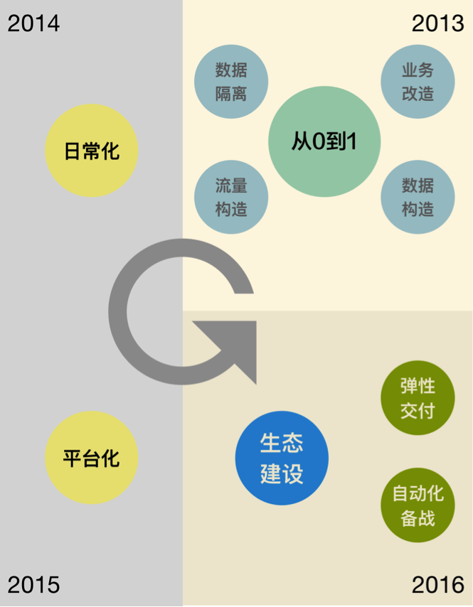 2016年在三地五单元混合云部署架构下,电商一半以上的资源都部署在云上。如何能够在最短的时间内完成一个单元的搭建和容量准备成为摆在我们面前的一道难题。“大促容量弹性交付产品”在年初的时候立项,旨在减少甚至释放活动场景的容量交付中人工投入,将大促容量交付的运维能力沉淀到系统中,使全链路容量具备“自动化”调整的能力。Aliware又提出了大促自动化备战的想法,将大促容量准备的各环节进行系统层面的打通,从业务因子埋点、监控体系、模型预测、压测数据构造、压测流量发送、压测结果分析、压测报表进行自动化的串联,大幅缩减了我们在大促容量准备阶段的人员投入和时间周期。围绕全链路压测的核心基础设施,全链路压测的周边生态逐步建立起来,打通建站、容量、监控等配套技术体系。