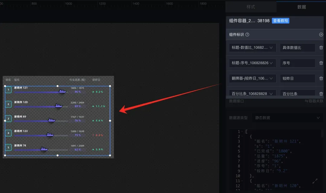 如何处理这种给下游开发小哥暴增工作量的搭建方式呢?EasyV中的组件容器则是为助力用户更加高效、灵活地搭建可视化项目而诞生的。用组件容器,只需2步就能实现根据数据动态生成重复型组件!