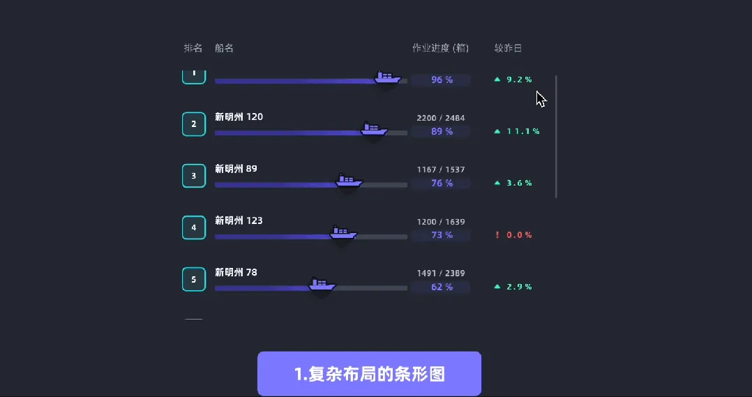很多时候,别人效率高可能并不是因为能力更强,而是用对了工具。比如同是用Excel填日常的数据,有的人通过计算器一个个算好后再分别复制进表格里,而有的人则是写好一个公式,直接下拉生成。前者虽然能够完成工作,但是费时费力,还可能因为复制错误导致数据偏差,后者用对了工具,半分钟就能拿到想要的结果。 同理,在可视化项目建设的过程中,经常有多模块重复组件、自定义拼接组件、组合展示需求。例如下面这种复杂的布局图表,无法通过一个组件实现,必须用多个不同组件拼接而成。不同人采用不同的方式,虽然能完成相同的结果,但是用的时间和力气却是天差地别。