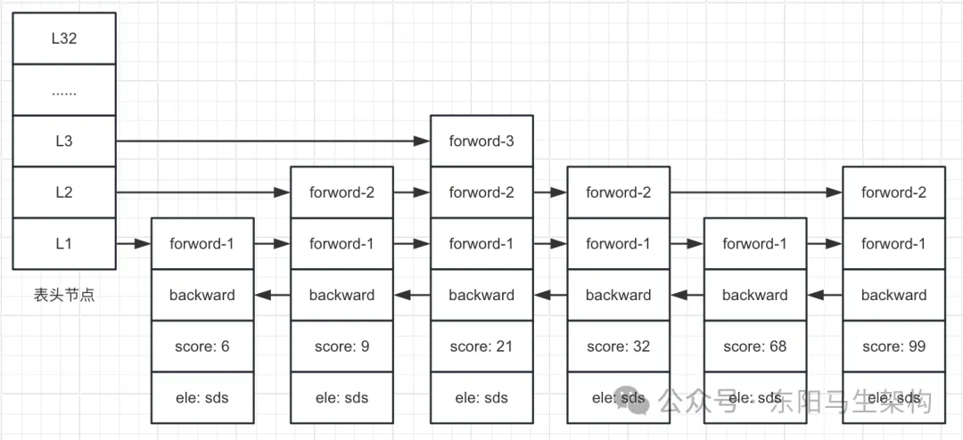 //zskiplist跳跃表的结构如下: header: 指向跳表的表头结点 tail: 指向跳表的表尾结点 level: 层数最大的结点的层数(表头结点不算) length: 跳表长度,即结点数量 //zskiplistNode跳跃表结点的结构如下: *backward: 后退指针 score: 分值 obj: 成员对象 zskiplistLevel: 层数组 //zskiplistLevel的结构如下: *forward: 前进指针 span: 跨度