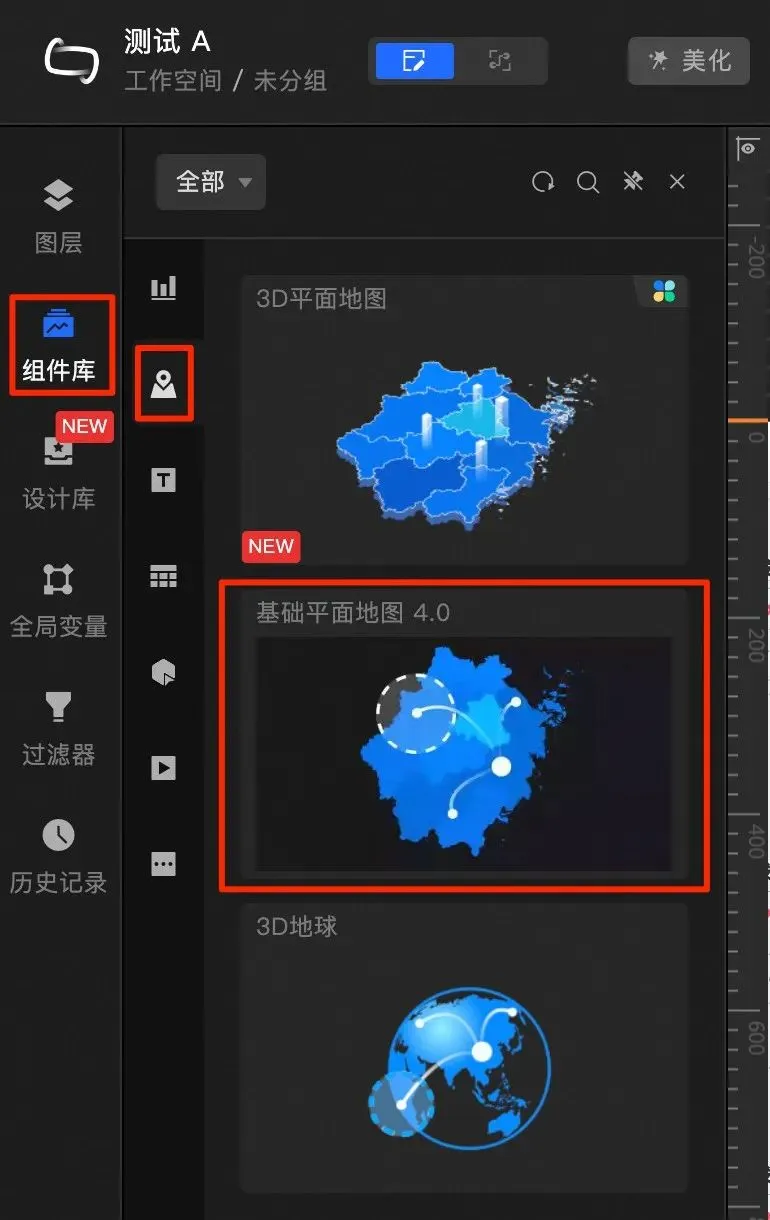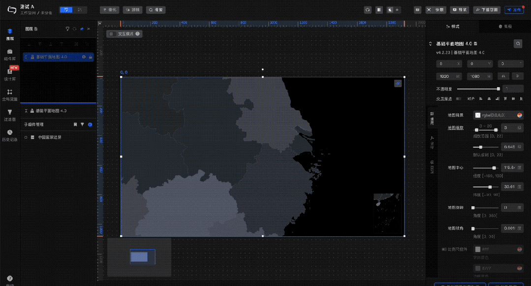 创建可视化看板之后,在右侧菜单-组件库中,添加“基础平面地图”组件
