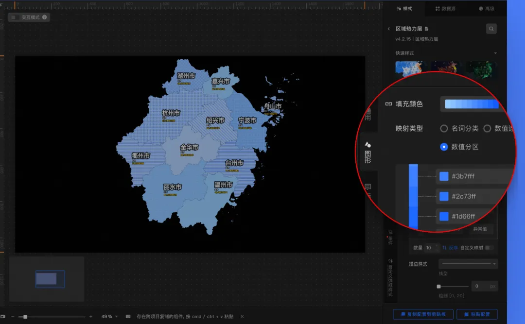 点击“应用”按钮之后,可以发现数据地图的各个地区热力颜色发生了变化,业务数据已经成功映射到浙江省地图上✌️。