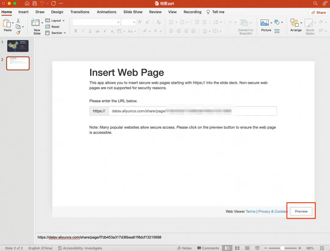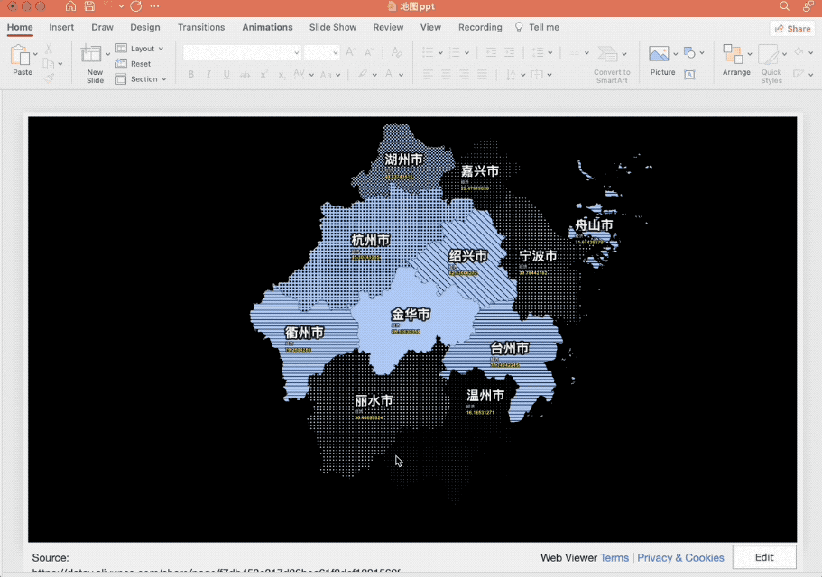 点击编辑器右上角“发布”按钮,获得数据地图网页地址,用于导入到 PPT 中: