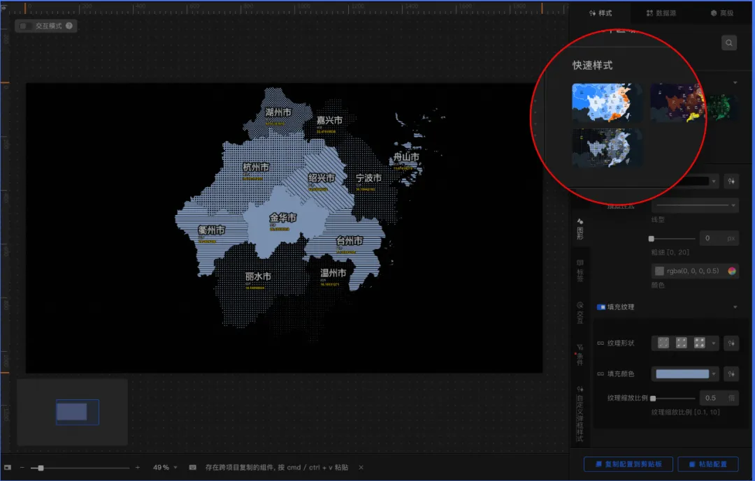 DataV“基础平面地图”的区域热力地图功能提供了2种热力样式调整方式。