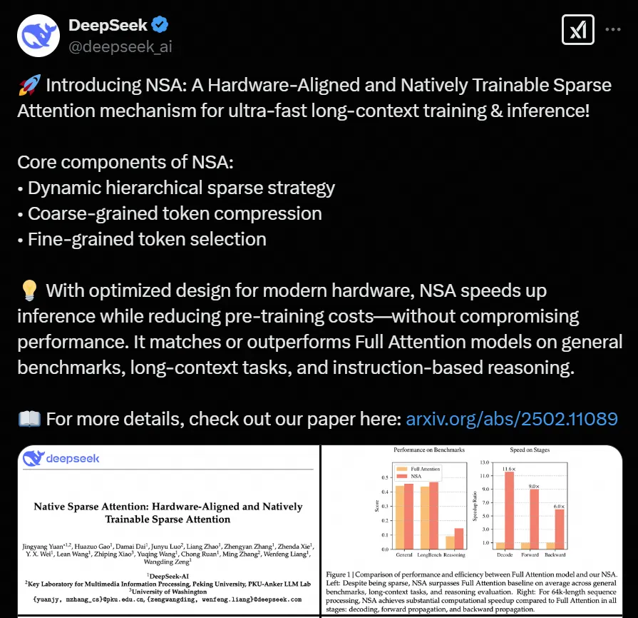 DeepSeek发布稀疏注意力机制NSA论文 | 图源X社交媒体平台DeepSeek账号