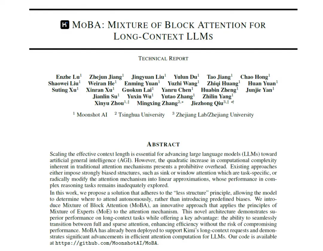 Kimi杨植麟署名发布新注意力架构MoBA,并公开代码
