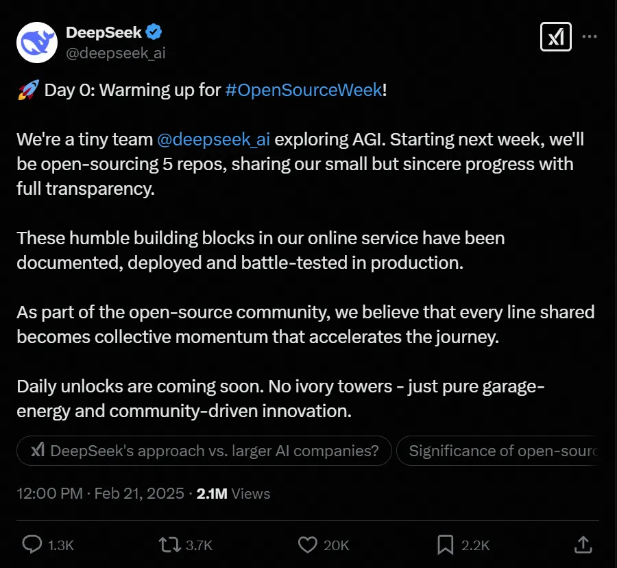DeepSeek本周起将开源5个代码库 | 图源X社交媒体平台DeepSeek账号