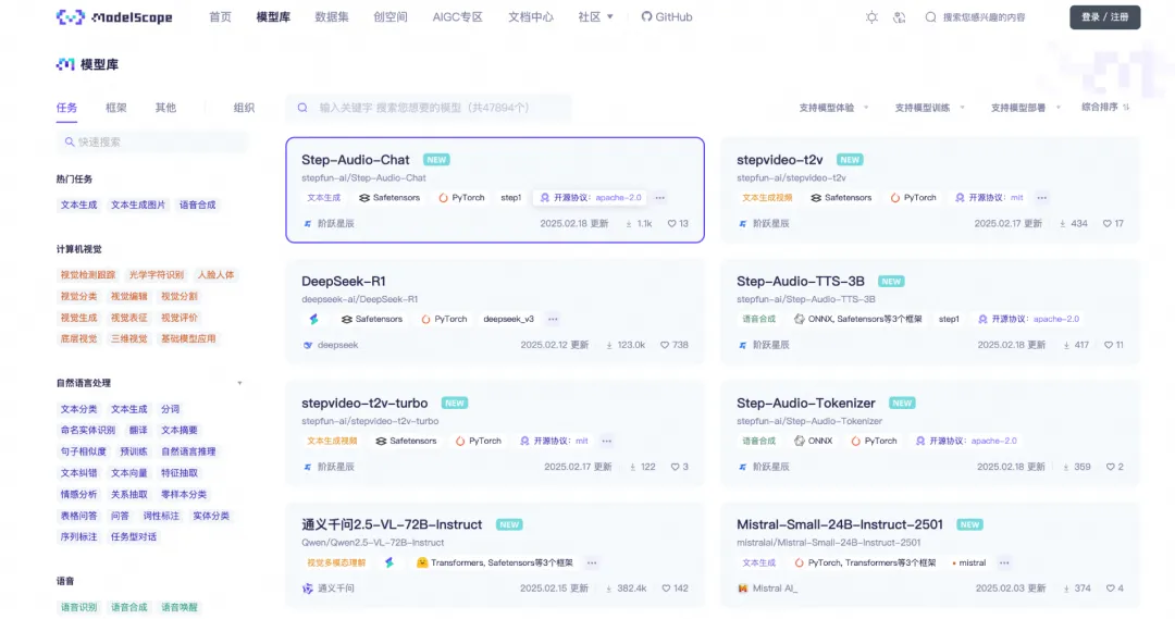 今日,在全球开发者大会(GDC)上,阿里云魔搭社区首发阶跃星辰最新开源的两款多模态模型,包括全球参数量最大的开源视频生成模型Step-Video-T2V,以及业界首款产品级开源语音交互模型Step-Audio。截至目前,魔搭社区已上架超过4万个开源模型,涵盖LLM、对话、语音、文生图、图生视频等多个领域,是中国最大的AI模型社区。