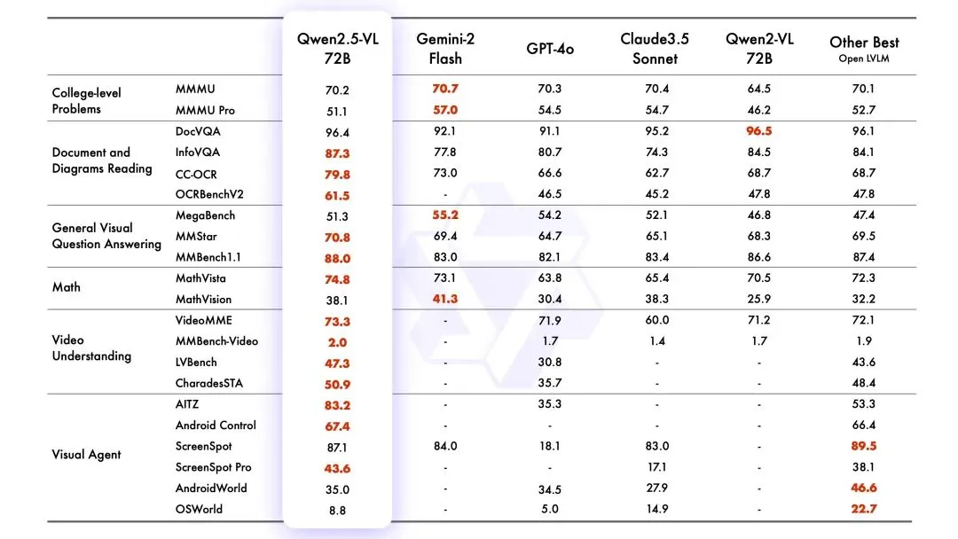 本次开源的 Qwen2.5-VL 模型,我们推出 3B、7B 和 72B 三个尺寸版本。其中,旗舰版Qwen2.5-VL-72B在13项权威评测中夺得视觉理解冠军,全面超越GPT-4o与Claude3.5。新的Qwen2.5-VL能够更准确地解析图像内容,突破性地支持超1小时的视频理解,无需微调就可变身为一个能操控手机和电脑的AI视觉智能体(Visual Agents),实现给指定朋友送祝福、电脑修图、手机订票等多步骤复杂操作。
