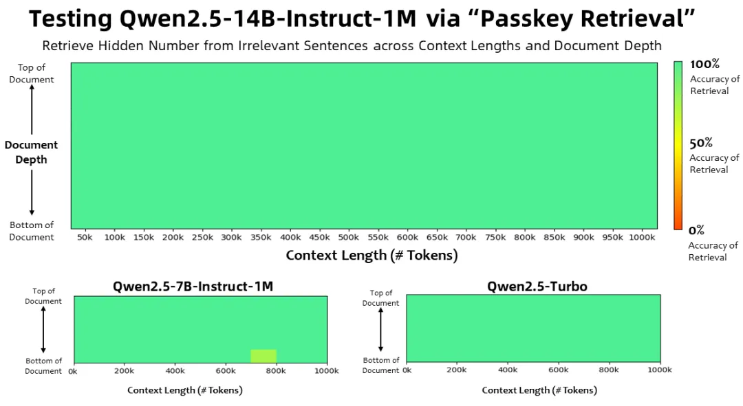 在上下文长度为 100 万 Tokens 的大海捞针(Passkey Retrieval)任务中,Qwen2.5-1M 能够准确地从 1M 长度的文档中检索出隐藏信息,仅有 7B 模型出现了少量错误。