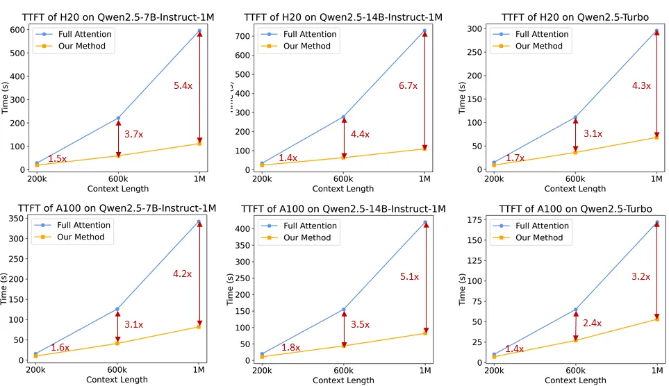 对于长上下文的语言模型,推理速度对用户体验至关重要。为了加速预填充阶段,我们引入了基于 MInference 的稀疏注意力优化。并在分块预填充、集成长度外推方案和稀疏性优化等多环节创新改进。基于这些改进的推理框架有效地加快了模型推理速度,在不同模型大小和 GPU 设备上,处理 1M 长度输入序列的预填充速度提升了 3.2 倍到 6.7 倍。
