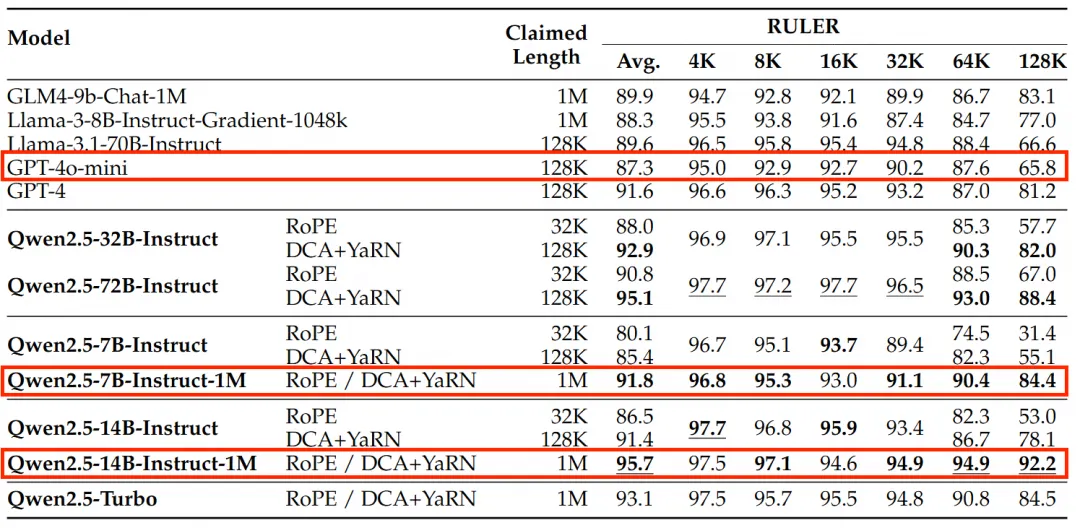 本次开源的 Qwen2.5-1M 大模型,我们推出7B、14B两个尺寸,均在处理长文本任务中稳定超越GPT-4o-mini;同时开源推理框架,在处理百万级别长文本输入时可实现近7倍的提速。这也是我们首次将开源 Qwen 模型的上下文扩展到 1M 长度。