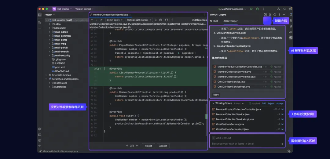 在与AI程序员的协作过程中,双方将以多轮对话的方式逐步完成任务,并生成多个快照版本,供开发者根据需要任意切换或回退。AI程序员限时免费开放欢迎访问通义灵码官网开启你的智能编程